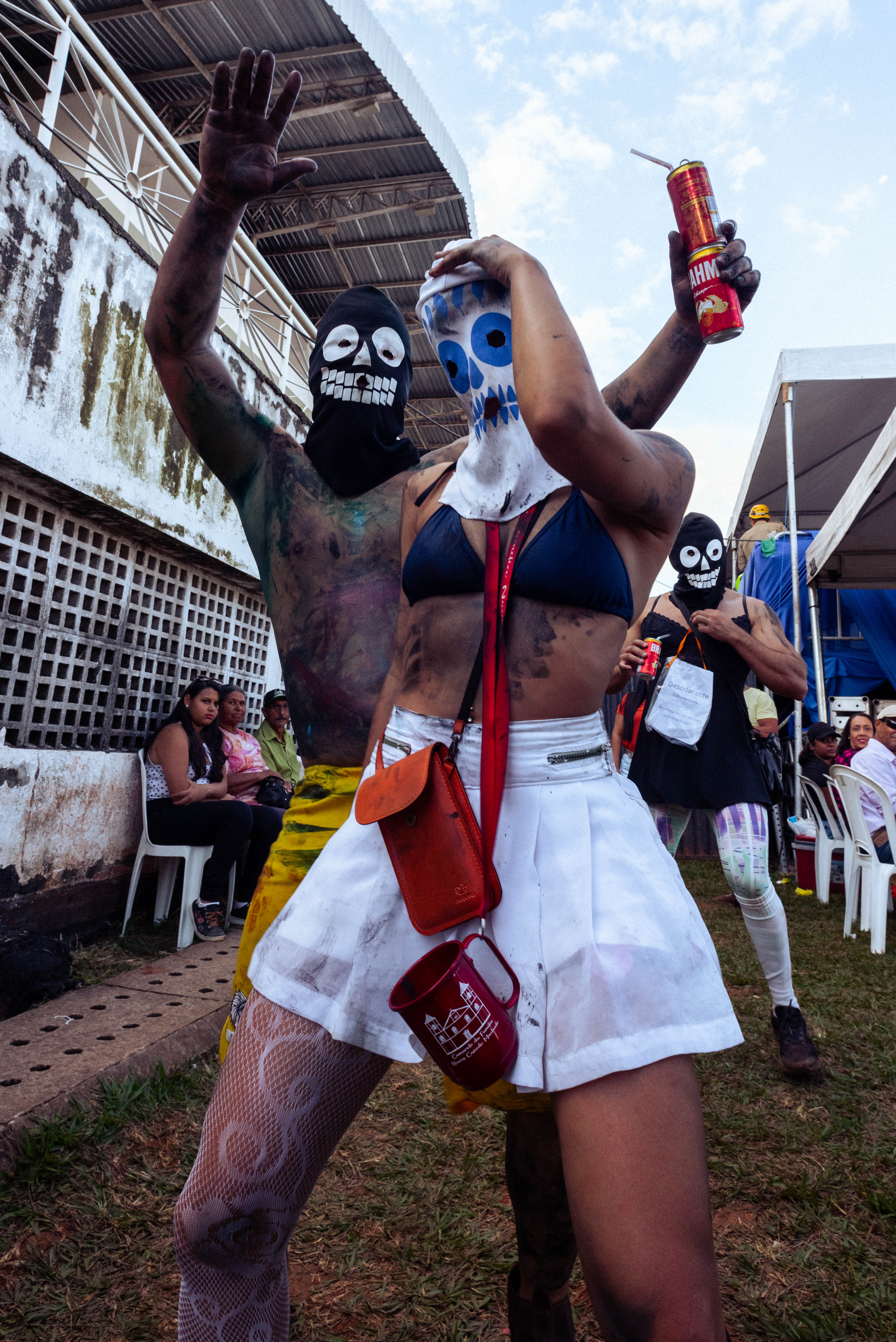 For the last 20 years (relatively recent), the second day of the Cavalhadas has become the day of the “Índios”. Boys and girls dress up in costumes that mimic indigenous attires, cover themselves in bodypaint and spend the morning and afternoon partying; boys on one side of the town and girls on the other. In the early evening they all convene at the Cavalhodromo and participate as Mascarados. Photos below: